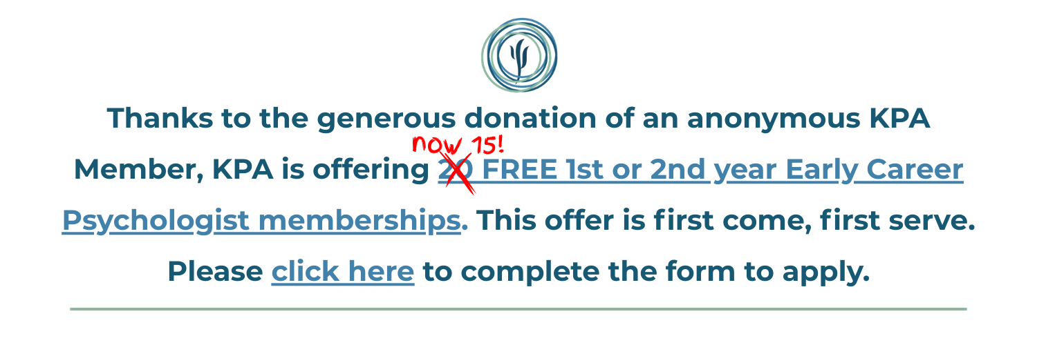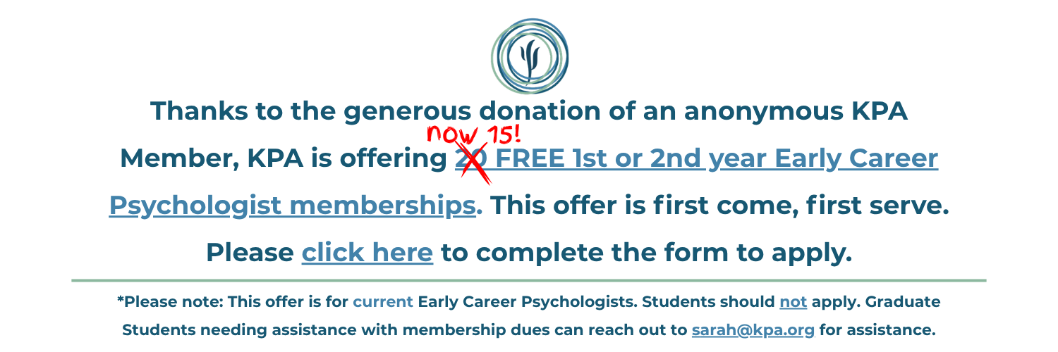 About usThe Kentucky Psychological Association has represented the interests of psychologists in the Commonwealth of Kentucky since 1932. Voting members include doctoral and master's level psychology professionals with a variety of training experiences and work placements. Affiliate members include students (from undergraduate through the post-doctoral year) and out-of-state psychology professionals. Allied health professionals may join as a KPA Supporter. To learn more about the benefits of membership or to join online, click here. The Association has developed a strong voice in Frankfort on issues of practice and regulation, inclusion of mental health services in health care reform, and advocacy for services for the mentally ill. KPA has played a leadership role in developing coalitions with other professions, agencies, and advocates to provide greater coordination of services and public education on mental health issues. Click here to keep reading. Click here to read our statement on SB 351